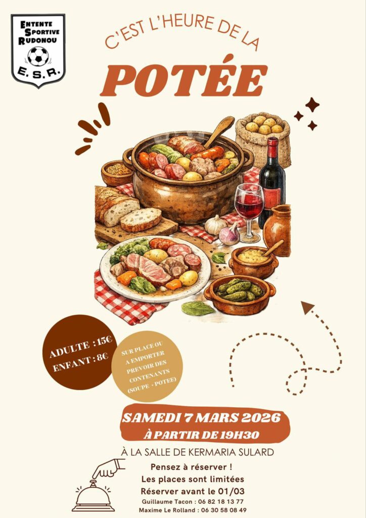 L’Entente Sportive du Rudonou organise sa traditionnelle potée le samedi 7 mars, sur place ou à emporter, à la salle de Kermaria-Sulard à partir de 19h30.