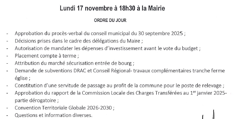Conseil municipal lundi 17 novembre 18h30 Soizic 13 novembre 2025 Divers Navigation de l’article Previous Previous post: Sapins de noël de l’Amicale Laïque du RudonouNext Next post: Coupure de courant le 3 décembre 2025 Articles en relation Coupure de courant le 3 décembre 2025 13 novembre 2025 Divers Sapins de noël de l’Amicale Laïque du Rudonou 13 novembre 2025 Divers Bibliothèque recherche bénévoles 12 novembre 2025 Divers