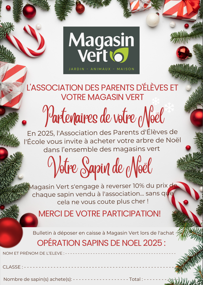 L’amicale laïque du Rudonou organise en partenariat avec Magasin Vert, une opération Sapins de noël. Pour chaque sapin acheté dans un Magasin Vert de la région,10 % du montant sera reversé à l’association pour financer les projets scolaires et les activités de enfants.