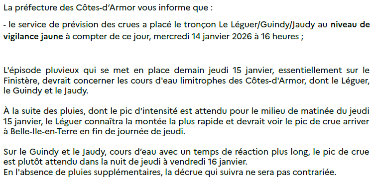 Vigilance Jaune Crue Soizic 15 janvier 2026 Divers Conseils à relayer : Navigation de l’article Previous Previous post: Cérémonie des voeux de Coatréven Articles en relation Cérémonie des voeux de Coatréven 6 janvier 2026 Divers Atelier numérique – mardi 13 janvier à 14h 6 janvier 2026 Divers Transport scolaire 4 janvier 2026 Divers