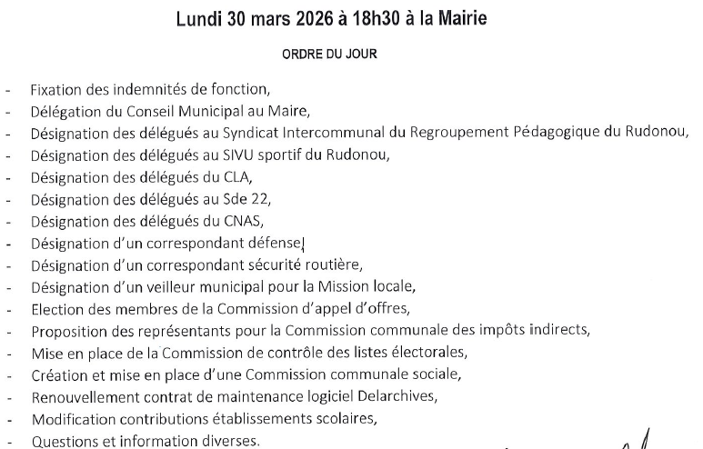 Conseil municipal Lundi 30 mars 18h30 Soizic 25 mars 2026 Divers Navigation de l’article Previous Previous post: Alerte Météo Vigilance Jaune Vents Articles en relation Alerte Météo Vigilance Jaune Vents 25 mars 2026 Divers Lutte contre les frelons asiatiques 23 mars 2026 Divers Offre emploi RPI du Rudonou 20 mars 2026 Divers