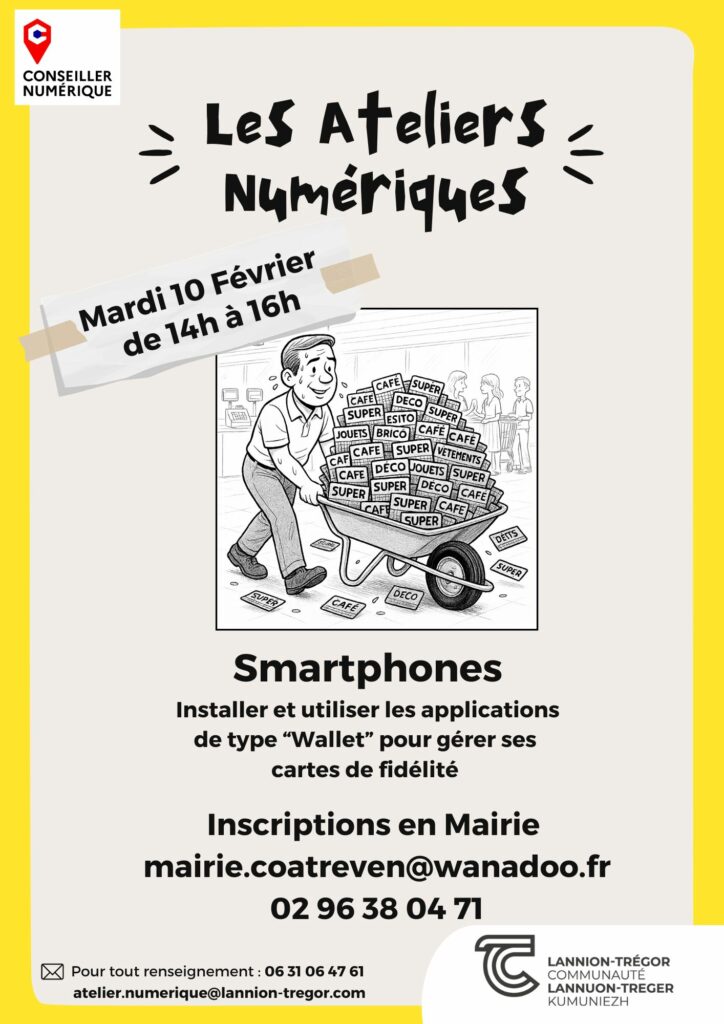 Prochain atelier numérique, le mardi 10 février de 14h à 16h sur le thème de l’utilisation du « wallet », c’est à dire le portefeuille électronique pour gérer ses cartes de fidélité, voire de paiement pour les plus courageux. C’est un atelier dédié au smartphone.